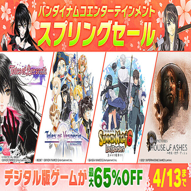| 「テイルズ」や「SAO」などが最大65%OFF! バンナム「スプリングセール」開催 …っている。 □バンダイナムコ「スプリングセール」対象タイトル一覧のページはこちら ■ バンダイナムコ「スプリングセール」対象商品一覧(一部) □「テイルズ… (出典:Impress Watch) |