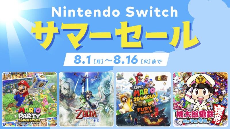 「Nintendo Switch サマーセール」8月1日開催!! 2022年07月30日 カテゴリ:ゲームセール情報 「Nintendo Switch サマーセール」8月1日開催!! (出典 topics-cdn.nintendo.co.jp) 最大30%オフ! 「Nintendo Switch サマーセール」が8月1日より開催 - GAME Watch 最大30%オフ! 「Nintendo Switch サマーセール」が8月1日より開催 GAME Watch「Nintendo Switch サマーセール」8月1日から開催決定!全12タイトルが最大30%オフに(インサイド) - Yahoo!ニュース Yahoo!ニュース任天堂、最大30%オフの「Nintendo Switch サマーセール」を8月1日0時から開始 価格.com「Nintendo Switch サマーセール」8月1日開催へ。任天堂主導セール、幅広く12作品対象 AUTOMATON『マリオパーティ スーパースターズ』が20%オフ、『桃鉄』が30%オフとなるNintendo Switch向けセールが8月1日から開催決定。夏にぴったりの『オラ夏』も30%オフに 電ファミニコゲーマーGoogle ニュースですべての記事を見る (出典:GAME Watch) 【「Nintendo Switch サマーセール」8月1日開催!!】の続きを読む